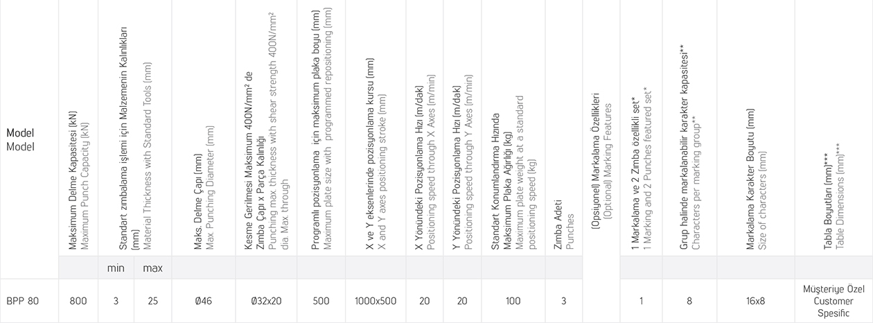 For BPP 80 model, plate positioning with standard programming is limited to 1000×500 sized and 100kg weight part. Manually punching is possible for 1000×500 sized or 250 kg weight plate where the punching area is suitable.